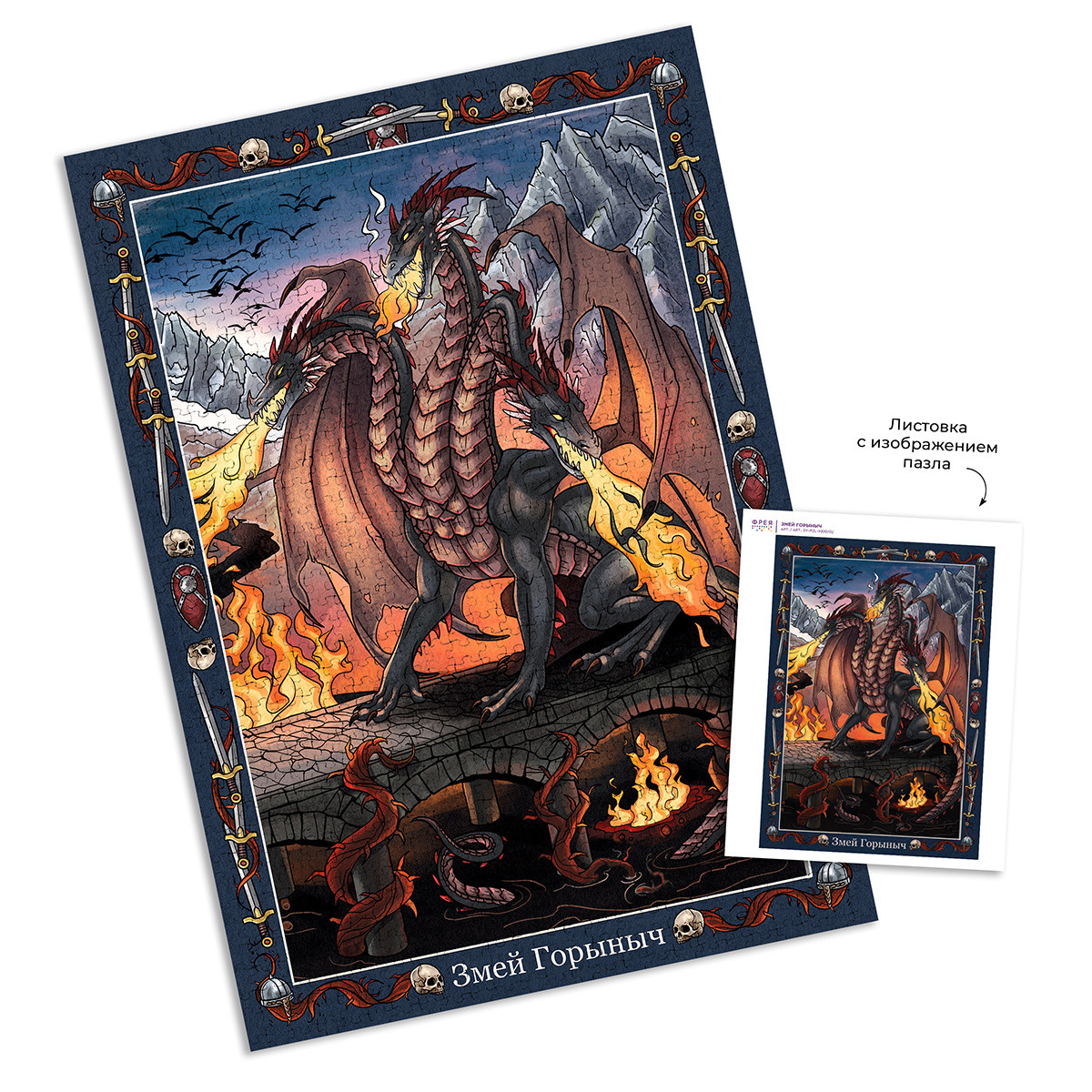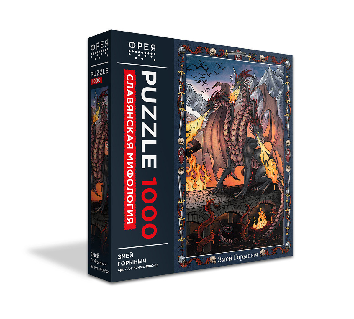 Пазлы ТМ Фрея - это яркие, интересные, увлекательные дизайны. Специально для вас мы разработали уникальную серию картин " Славянская мифология". Готовый пазл с таким сюжетом может стать интересным и необычным украшением интерьера. Также пазлы ТМ Фрея будут отличным подарком для ваших близких. Детали пазлов этой серии толще обычных. Для изготовления деталей мы используем европейский картон премиум качества. Такой картон не деформируется и не расслаивается даже при многократной сборке пазла. Размер готовой работы может отличаться от указанной на сайте. Актуальная информация размещена на упаковке товара. Змей Горыныч - могучее волшебное существо из русских народных сказок в образе многоголового змея. Этот змей обитает в горах, потому его прозвали Горынычем. Он охраняет логово Кощея и Тридевятое царство. Со Змеем герой может встретиться и у Калинова моста через реку Смородину. Река - граница, которую можно пересечь, только победив Змея Горыныча. Сообщить о неточности в описании Подборки товаров