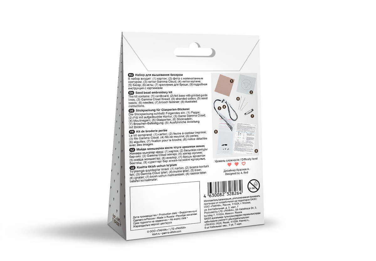 В набор для вышивания Klart входит: фетр с напечатанным контуром, фетр, бисер, хлопчатобумажные нитки мулине Gamma, тонкая игла для вышивания бисером Gamma, замок для броши, картонная заготовка, подробная инструкция с цветными иллюстрациями. Брошь, сделанная своими руками, – эффектный аксессуар как для повседневного образа, так и для праздничного мероприятия. Брошь может стать отличным подарком родным, близким, друзьям и коллегам. Сообщить о неточности в описании Подборки товаров