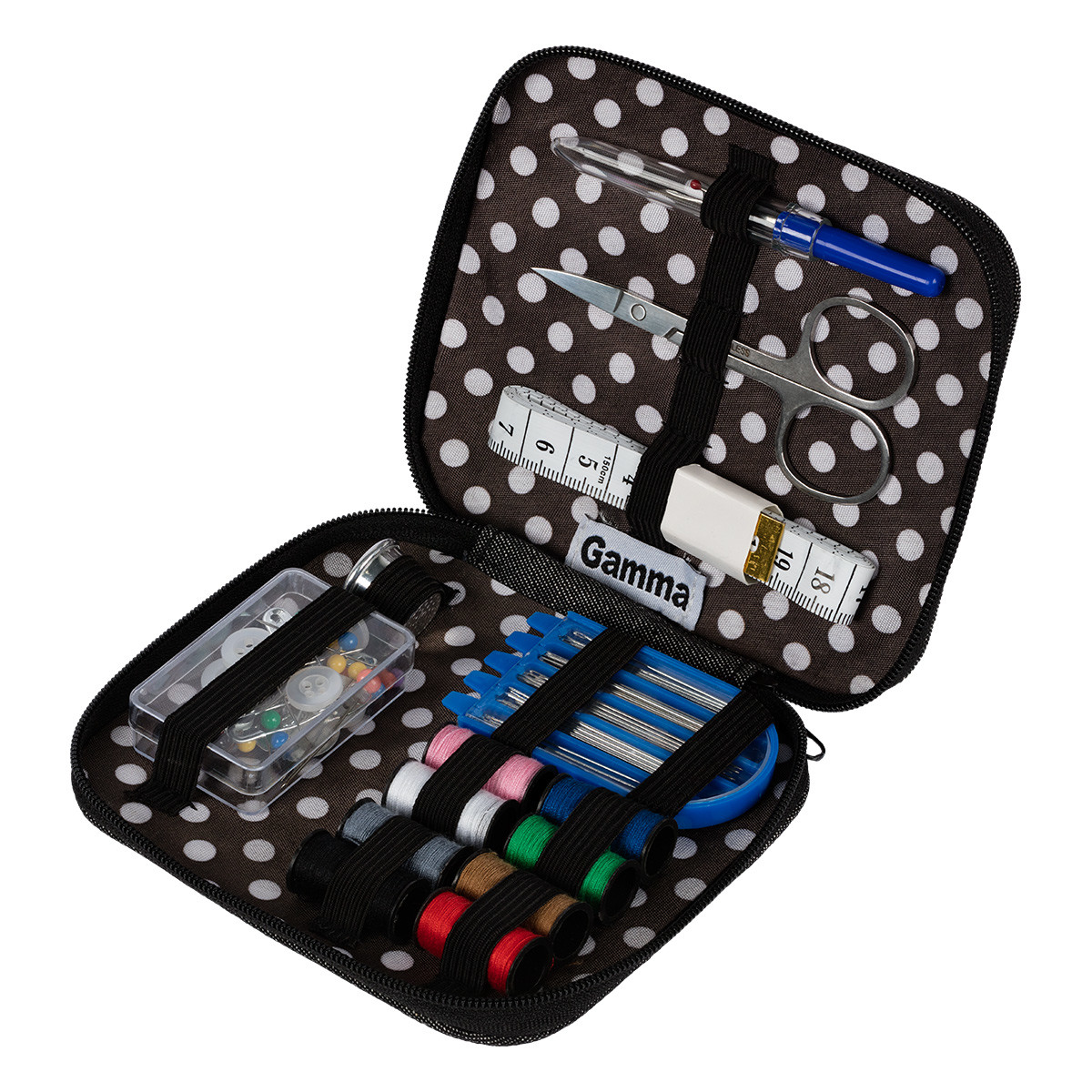 Набор для шитья CEB- 02 Gamma включает все необходимое для быстрого ремонта: нитки, иглы ручные, наперсток, мини- ножницы, булавки, нитковдеватель и прочее. Все комплектующие лежат аккуратно в компактном черном пенале, удобен для хранения. Швейный набор подойдет в качестве подарка и для путешествий. швейные нитки на мини- катушках 8 разных цветов, ножницы - 1 шт., сантиметровая лента 150 см/ 60 дюймов- 1 шт., вспарыватель - 1 шт., иглы швейные - 25 шт., иглы для закалывания - 20 шт., английские булавки - 6 шт., кнопки пришивные - 3 пары, пуговицы - 6 шт., нитковдеватель - 1 шт., наперсток - 1 шт. Все принадлежности упакованы в пенал из джинсовой ткани на молнии. Размер пенала: 11х12х2. 5 смСообщить о неточности в описании Рекомендуем посмотреть