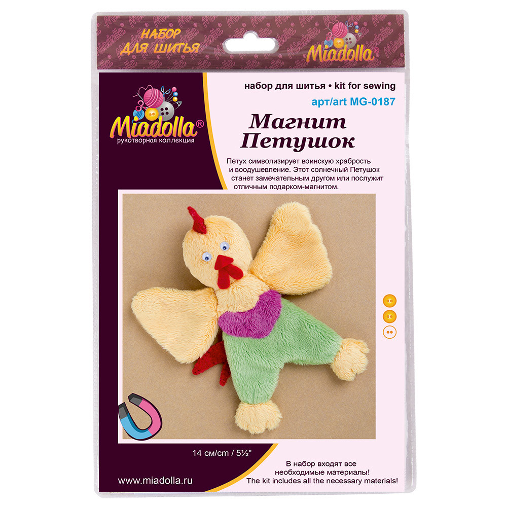 В набор входят все необходимые материалы для изготовления игрушки: глаза, магниты, мулине " Gamma", нитки, плюш, фетр, пуговицы, синтепон, игла, выкройка и подробная пошаговая инструкция с картинками. Игрушку с магнитами в лапках можно прикрепить на холодильник или другую металлическую поверхность. Голова игрушки крепится на пуговице, благодаря чему поворачивается на 360 градусов. Петушок – яркая и артистичная личность. Он встречает утро заливистым пением и высоко задирает нос, когда его хвалят. Петушок умеет вертеть головой и любит рассматривать все вокруг. Этот солнечный Петушок станет замечательным другом или послужит отличным подарком- магнитом. Сообщить о неточности в описании С этим товаром покупают