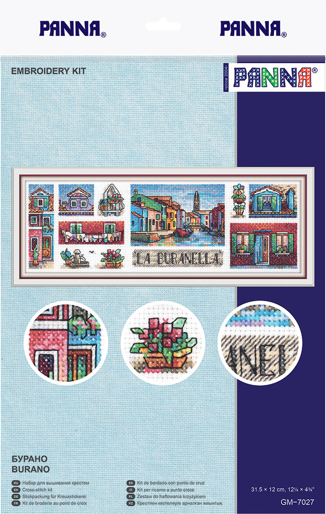В набор для вышивания " PANNA" входит: канва К04 Aida №14 " Gamma" , хлопчатобумажные нитки мулине " Gamma" на держателе, игла " Gamma" для вышивания, подробная инструкция по вышиванию и схема. Вышивка разработана по мотивам видов островного квартала Венеции Бурано. Характерная и привлекательная черта этого знаменитого городского пейзажа – яркая расцветка домов. Подборки товаров