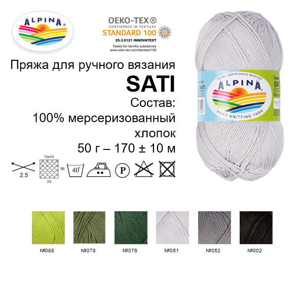 Пряжа ALPINA " SATI" прекрасно подходит как для вязания изысканных ажурных узоров крючком, так и для гладкого полотна, связанного на спицах. В любом случае изделие будет мягко прилегать к коже, не создавая статического электричества, пропускать воздух. Вещи, выполненные полностью ажурной вязкой, будут замечательно смотреться и долго служить, не выцветая и сохраняя форму. Плотно скрученная тонкая хлопковая нить. Пряжа легко вяжется и хорошо ложится в рисунок. Мерсеризованный хлопок - это обработанная особым способом хлопковая нить. В результате такой обработки пряжа приобретает блеск, мягкость и шелковистость, высокую устойчивость цвета. Мерсеризованный хлопок - это прекрасный материал, отлично поглощающий влагу и удобный в работе, а также красивый, прочный и экологичный. Уход за готовым изделием: ручная стирка t- 40, гладить при температуре не выше 150 °С, щадящий режим химчистки, не отбеливать, не сушить в барабанной сушилке. На этикетке каждого мотка есть номер партии/ Lot. При покупке пряжи для одного изделия рекомендуем использовать один и тот же номер " lot", т. к. оттенок пряжи из разных партий может незначительно отличаться. Во всех видах пряжи Alpina состав на этикетке соответствует реальному. Тип пряжи: КлассическаяЦветовая палитра: однотонные классические цветаВ полотне 10х10 см - 36 рядов по 23 петли - лицевая гладьТолщина нити: тонкаяДлина нити: 170 м Вес: 50 гСостав: 100% мерсеризованный хлопокРекомендуемый диаметр спиц/ крючка для пряжи - 2. 5 ммПримечание: цвет товара может отличаться от цвета фотоСообщить о неточности в описании Подборки товаров