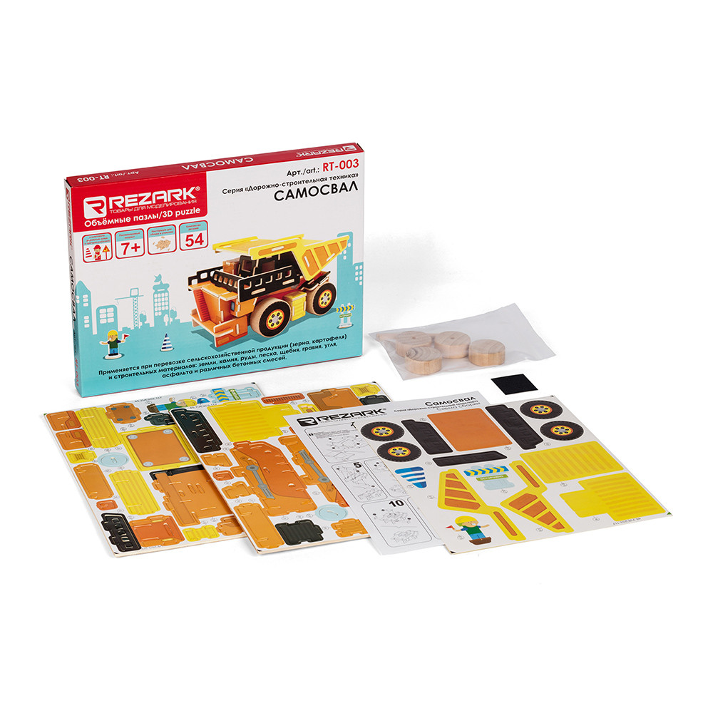 REZARK представляет детские, развивающие 3D- наборы для сборки, изготовленные из качественной фанеры. Данная серия посвящена дорожно- строительной технике. В состав набора входят детали пазла и иллюстрирующие их самоклеящиеся наклейки. Это и игрушка, и конструктор " два в одном". Сборка из 3D- пазлов развивает моторику рук, объёмное мышление и внимание. А подвижные элементы модели позволяют использовать её как полноценную игрушку, с которой можно играть, строить, перевозить и т. д. Такие наборы не только занимательны, но и познавательны. Маленькие строители и автолюбители с их помощью узнают о назначении каждой модели, особенностях её использования и способах проведения ремонтных, строительно- демонтажных, погрузочных и других видах работ. В набор также входят предупреждающие дорожные знаки соответствующей тематики. При сборке не требуются клеевые материалы - все детали скрепляются между собой с помощью пазов. Ребёнок сможет самостоятельно собрать целую серию транспорта для интересной и увлекательной игры. САМОСВАЛ применяется при перевозке сельскохозяйственной продукции и строительных материалов: земли, камня, руды, песка, щебня, гравия, угля, асфальта и различных бетонных смесей. Инструкция ( PDF) Сообщить о неточности в описании Подборки товаров