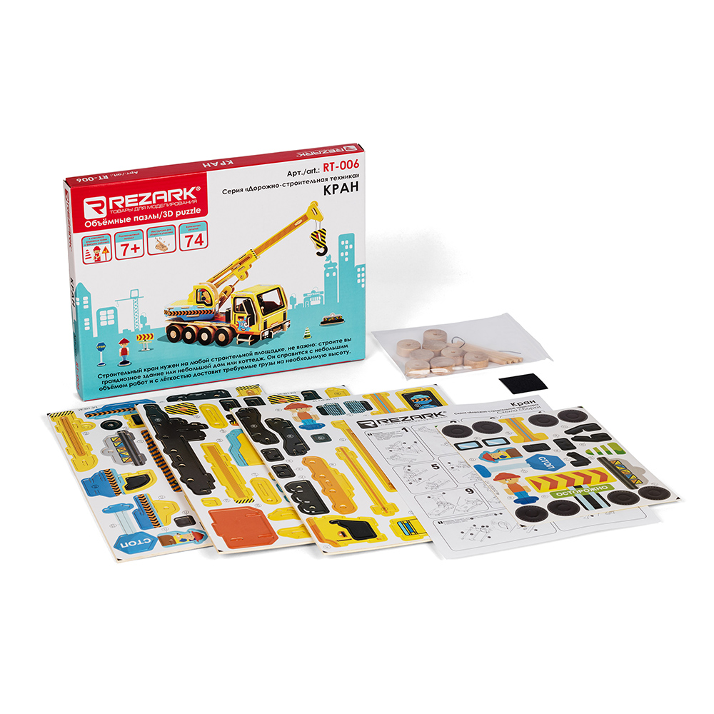 REZARK представляет детские, развивающие 3D- наборы для сборки, изготовленные из качественной фанеры. Данная серия посвящена дорожно- строительной технике. В состав набора входят детали пазла и иллюстрирующие их самоклеящиеся наклейки. Это и игрушка, и конструктор " два в одном". Сборка из 3D- пазлов развивает моторику рук, объёмное мышление и внимание. А подвижные элементы модели позволяют использовать её как полноценную игрушку, с которой можно играть, строить, перевозить и т. д. Такие наборы не только занимательны, но и познавательны. Маленькие строители и автолюбители с их помощью узнают о назначении каждой модели, особенностях её использования и способах проведения ремонтных, строительно- демонтажных, погрузочных и других видах работ. В набор также входят предупреждающие дорожные знаки соответствующей тематики. При сборке не требуются клеевые материалы - все детали скрепляются между собой с помощью пазов. Ребёнок сможет самостоятельно собрать целую серию транспорта для интересной и увлекательной игры. СТРОИТЕЛЬНЫЙ КРАН нужен на любой строительной площадке, не важно: строите вы грандиозное здание или небольшой дом или коттедж. Он справится с небольшим объёмом работ и с лёгкостью доставит требуемые грузы на необходимую высоту. Инструкция ( PDF) Сообщить о неточности в описании Подборки товаров